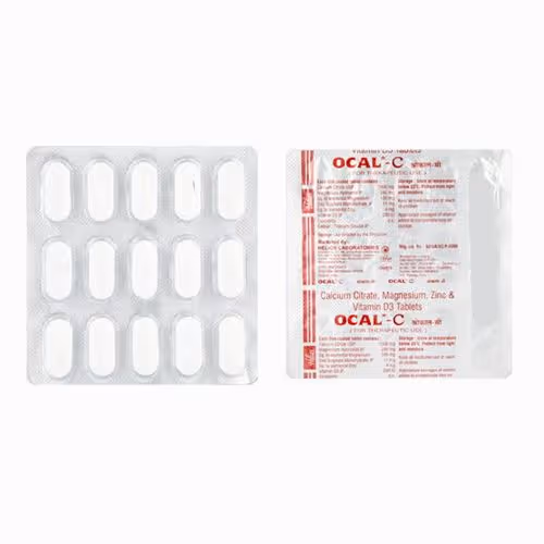Ocal C Tablet 15'S is used for Health Conditions. This contains CALCIUM CITRATE,MAGNESIUM HYDROXIDE,VITAMIN D3 (CHOLECALCIFEROL) ,ZINC SULPHATE combination.