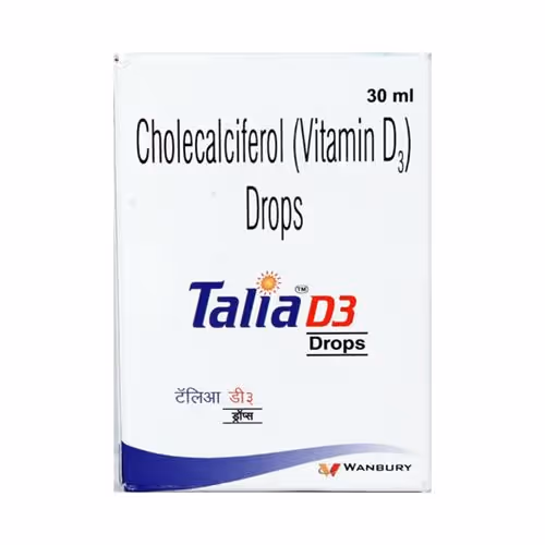 Talia D3 Drops 30ml is used for Vitamins & Nutrition. This contains Cholecalciferol (Vit D3) 400 IU combination.